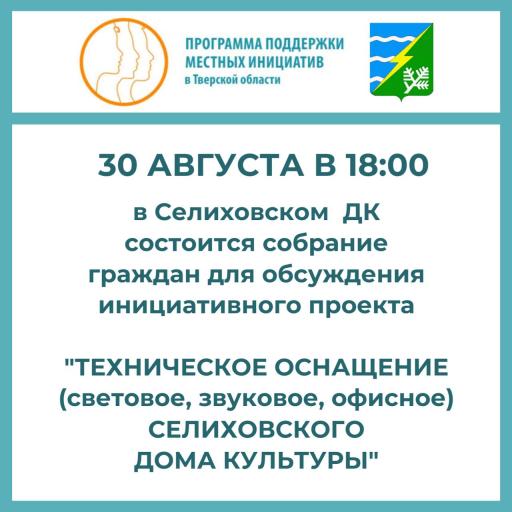 Инициативная группа, созданная для реализации инициативного проекта «Техническое оснащение (световое, звуковое, офисное) Селиховского сельского Дома Культуры» приглашает вас на собрание граждан, которое состоится 30 августа 2024 года в 18:00.