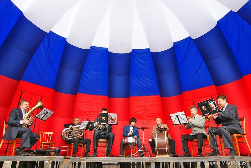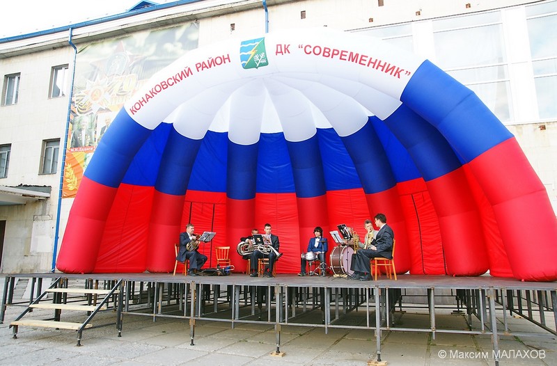 Сцена представляет собой так называемую надувную «ракушку» размером 10 на 6 метров и высотой 4 метра, раскрашенную в цвета российского флага и с надписью «Конаковский район. ДК «Современник». «Ракушка» устанавливается на подиум или любое другое основание. Сцена защищает выступающих на ней артистов от дождя и ветра, может легко собираться и перевозиться в другое место. Ее установка занимает не более 15 минут. Специальные бесшумные компрессоры поддерживают необходимое давление воздуха.